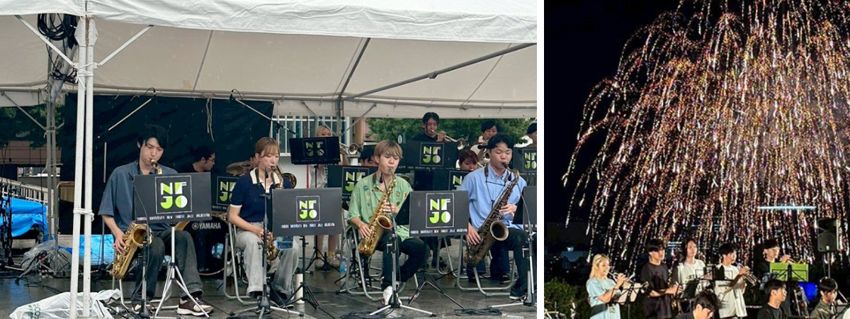 代表の安田侑真さん(理学部2年)は、「仙台の街並みを一望できる仙台城址で、夜空に花火が打ち上がる中、ビッグバンドのサウンドを響かせることができたことは、この上ない体験でした。演奏者と観客の皆様が一体となり、音楽と景色、そして花火が調和した瞬間は忘れられません。非常に多くのお客様にお越しいただき、NFJOの音楽を存分に楽しんでいただけたことを大変うれしく思います。ご来場くださった皆様、本当にありがとうございました。」と感謝のコメントを寄せました。